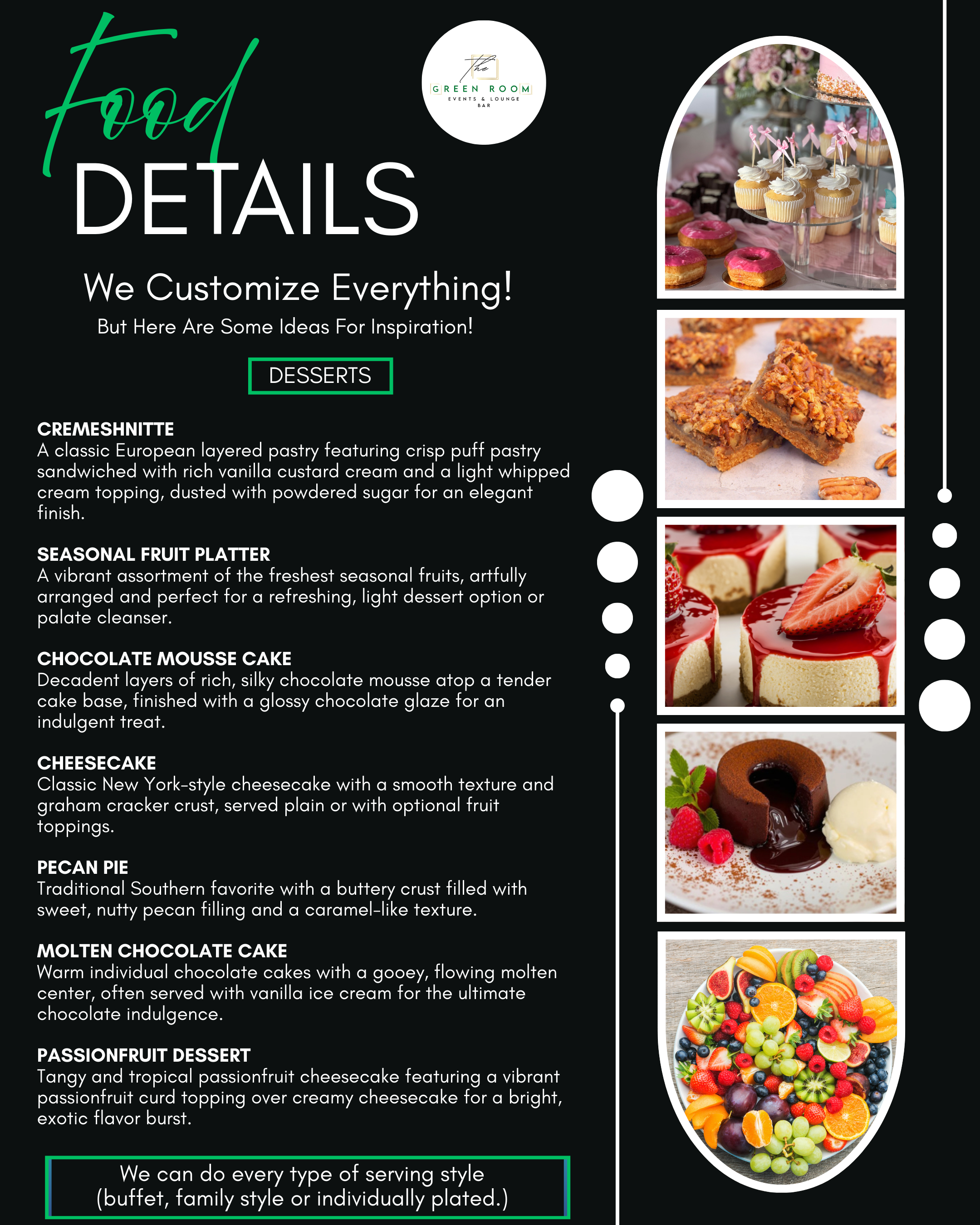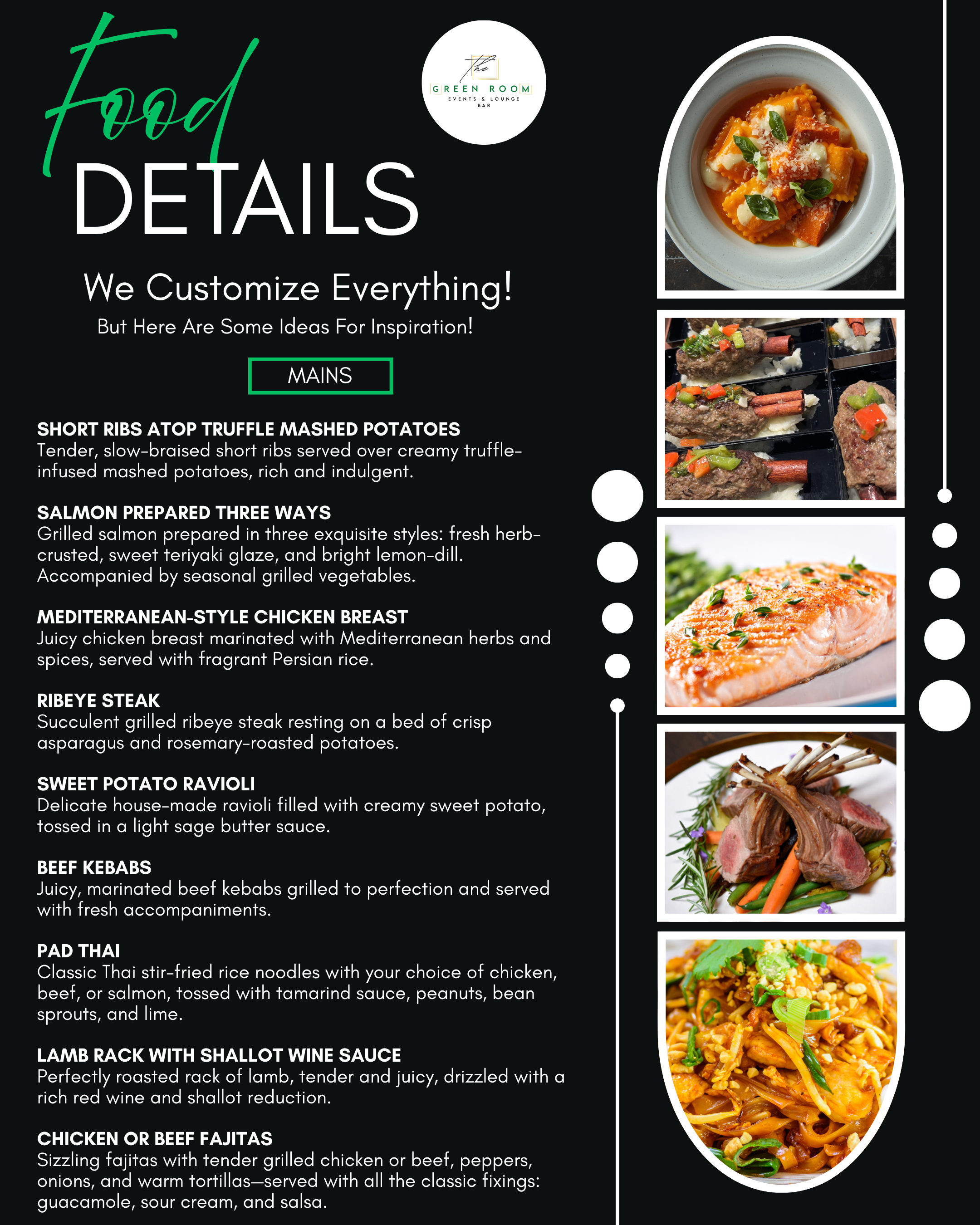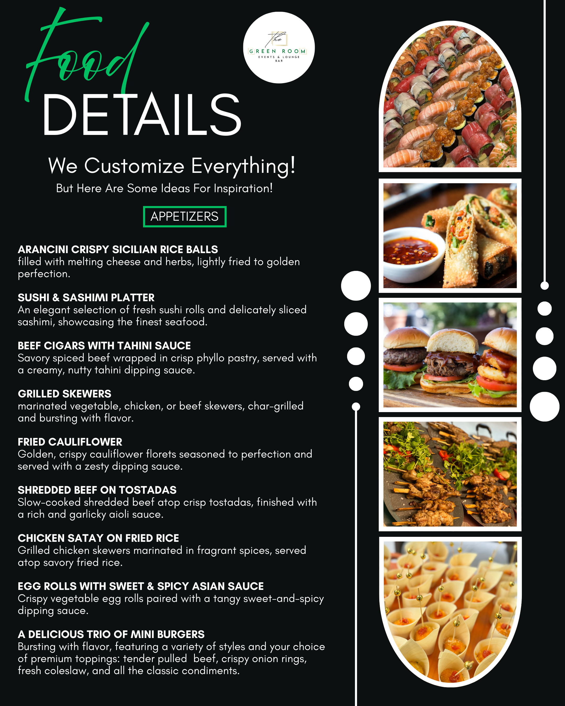 Our menu continues to evolve, with new dishes added regularly. The menu provided is only a sample — we are fully customizable and can cater to all cuisines to suit your tastes and event needs.